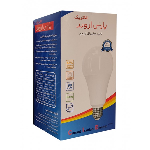 لامپ های ال ای دی 20 وات شرکت پارس اروند الکتریک مدل حبابی با سرپیچ E27 و رده انرژی +A از بهره نوری بالایی برخوردارند. این لامپ ها با گرمای بسیار ناچیزی که تولید می کنند جایگزین مناسبی برای لامپ های رشته ای می باشند و در سه رنگ آفتابی، مهتابی و یخی موجود می باشند. از دیگر مزایای لامپ های ال ای دی پارس اروند می توان به مصرف انرژی پایین و کاهش هزینه های انرژی، کاهش آلودگی محیط زیست بدلیل نداشتن جیوه، روشن شدن آنی،مقاومت بالا در برابر خاموش و روشن شدن زیاد، زاویه تابش گسترده، طول عمر زیاد بدون کم شدن نوردهی و نوردهی طبیعی بدون ایجاد خستگی چشم نیز اشاره کرد.